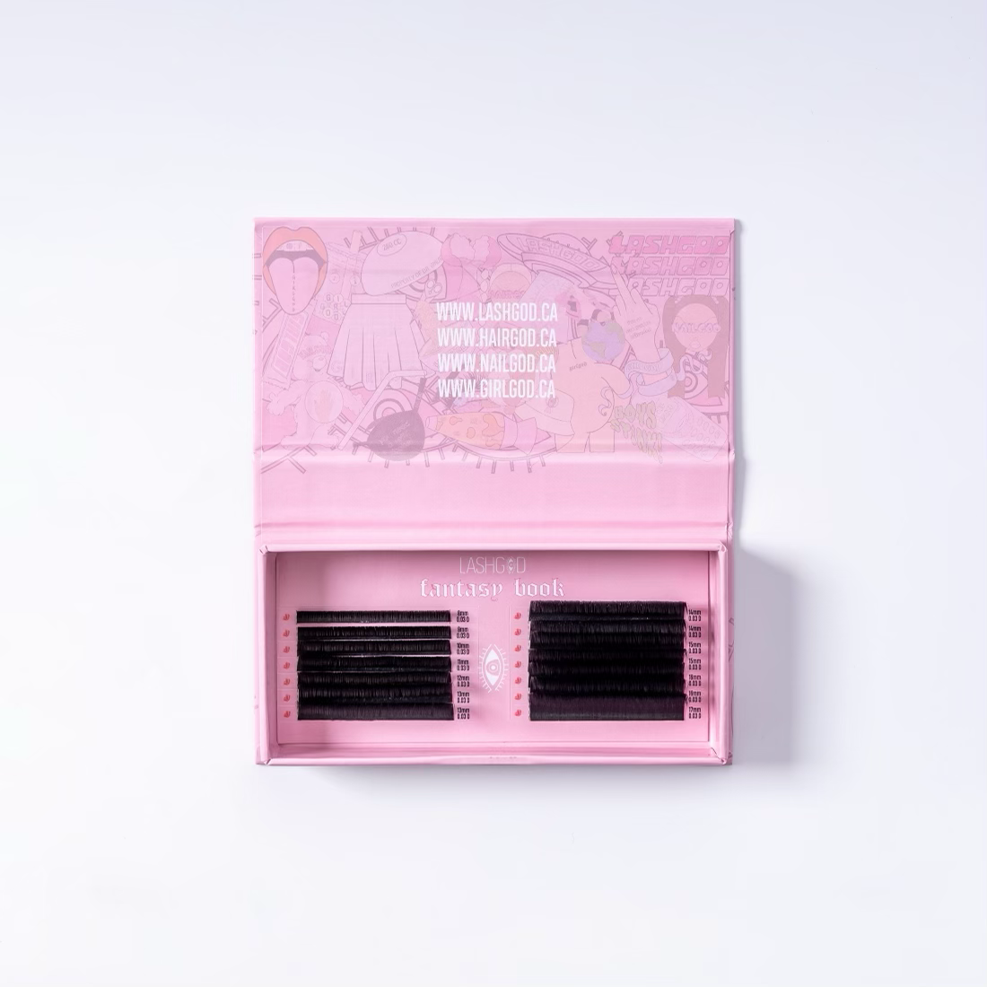 FANTASY BOOKEASY FANNING LASHES Introducing our new ultra thick ultra dark easy fanning cashmere lashes available in .03 & .05 volume thickness + mixed trays. Our revolutionary NEW self fanning trays require no fanning method, simply pick them up off the strip with the tips of your tweezers and watch them bloom into a perfectly symmetrical volume fan. 100% hypoallergenic, vegan, manufactured in our sterile facility. All LASHGOD lashes are made from the highest quality PBT fibres. Curled over a span of 3.5 weeks to maintain curl integrity for the full duration of attachment + 2.5-year shelf life in their packaging with proper storage! Say goodbye to extra long lash appointments and hello to easy fanning lashes that bloom with a needle-thin base for maximum client comfort and amazing retention!
